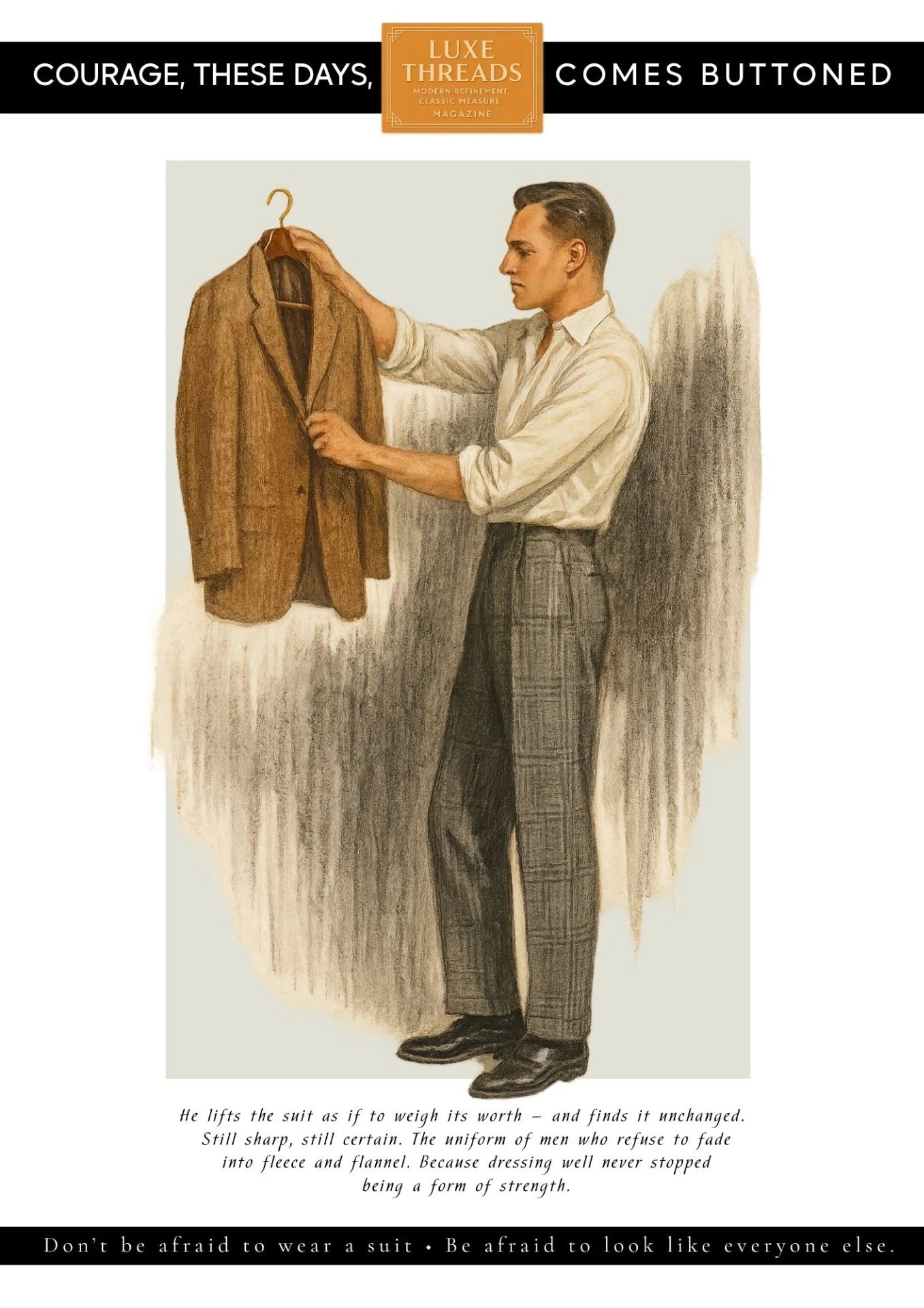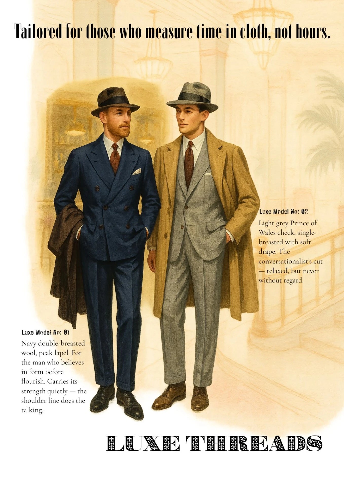 The monthly style showcase of Luxe Threads — curated looks and illustrated outfits from each issue, highlighting how modern tailoring can be worn with classic elegance.